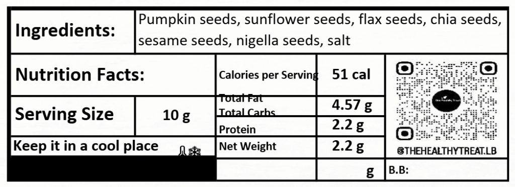 Our Seeds Cracker is made with a wholesome blend of sunflower seeds, pumpkin seeds, flaxseeds, chia seeds, nigella seeds, sesame seeds, and a touch of salt. Rich in flavor and loaded with superfoods, it’s the perfect snack to fuel your body while satisfying your cravings.